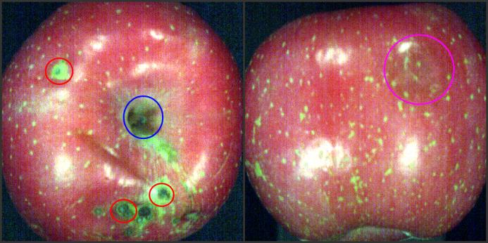 果蔬表面污染和损伤(例如动物粪便、轻微磕伤、病伤、虫蛀等)的检测对于生产者和消费者来说一直都是很重视的问题。普通的检测方法要么对果蔬表面有一定的损害,要么仅能够检测到部分表征,无法深入分析和检测。应用高光谱成像的方法既能够实现无损检测,又能够快速准确的获取样本的完整的图像信息和光谱信息。通过图像和光谱分析方法,检测果蔬的物理结构、化学成分和表面*征。