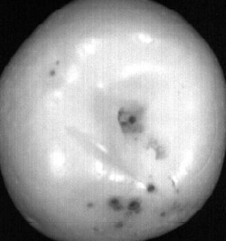 在果蔬表面污染和无损检测过程中,使用HyperSIS系列高光谱成像检测系统,在400-1000nm的可见光和近红外的光谱范围内,综合曝光时间、扫描速度和光谱校正等信息,采集到包括二维的图像像素信息和第三维的波长信息的“三维”图像块。由于高光谱数据具有多光谱通道、高光谱分辨率和连续光谱的*点,可分辨出极接近但不同波长下的两幅不同的图像(见图二),并可得到任意像素点的连续光谱曲线和不同物质的不同光谱曲线(见图三)。图一中,虽然可通过数码相机或人眼看到虫伤的痕迹,但挤压损伤处不是很明显。且在灰度图像中,这样的伤痕是看不到的。只有在某些*定波长下,轻微损伤区域与正常区域之间的光谱值会存在很大差异。