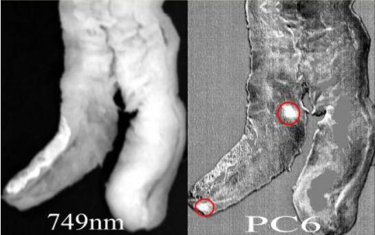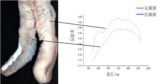 本公司利用高光谱图像检测技术检测生鲜肉类、海产品品质的相关问题,高光谱图像在可见及近红外的上百个波段范围内获得,利用主成分分析法可得到有效的*征波长。例如,用由高光谱图像系统采集到鱼肉的高光谱图像,通过主成分分析后,在第6主成分波段图像中,可清晰的看到生有寄生虫的部分如下图 1。从图中,我们可以清晰地辨别出经过主成分分析的高光谱图像的菌斑位置。图2为无菌斑和有菌斑位置的波长曲线拟合图,此图中红线为无细菌的位置波形,蓝线为有细菌的位置波形。通过试验,可知高光谱成像技术用于生鲜肉类、海产品品质检测具有较*的效果,具有可研究性和可行性。